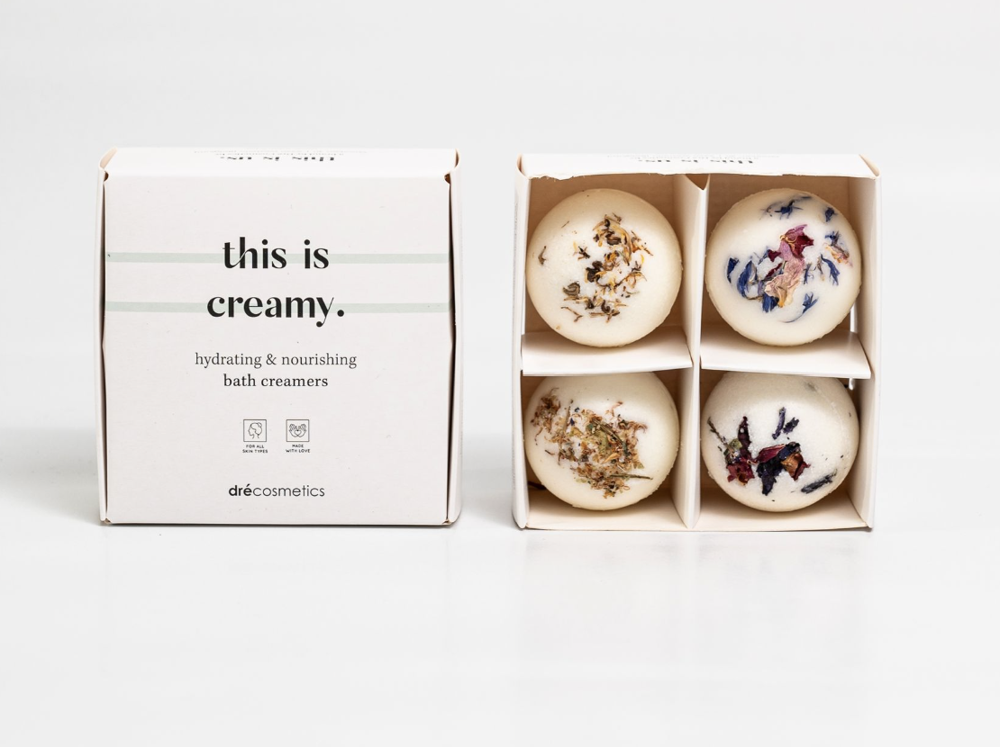 "this is creamy." bevat 4 hydraterende bath creamers verrijkt met hoogwaardige cacao- en karitéboter en amandelolie die de huid diepgaand verzorgen. De huid wordt zijdezacht en geurt heerlijk na. De ‘this is us.’ bath creamers, versierd met echte bloemblaadjes, stukjes fruit en zaden, maken van baden een onvergetelijke ervaring.